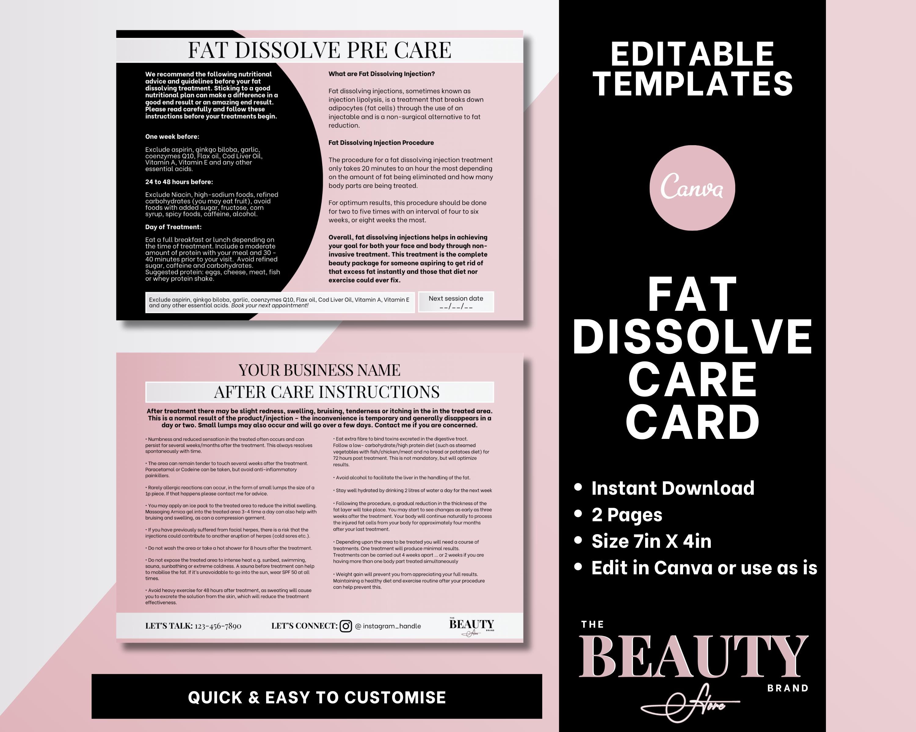 Fat Dissolve Client Care Card, Pre Treatment Care, Post Treatment Care, Editable Canva Template