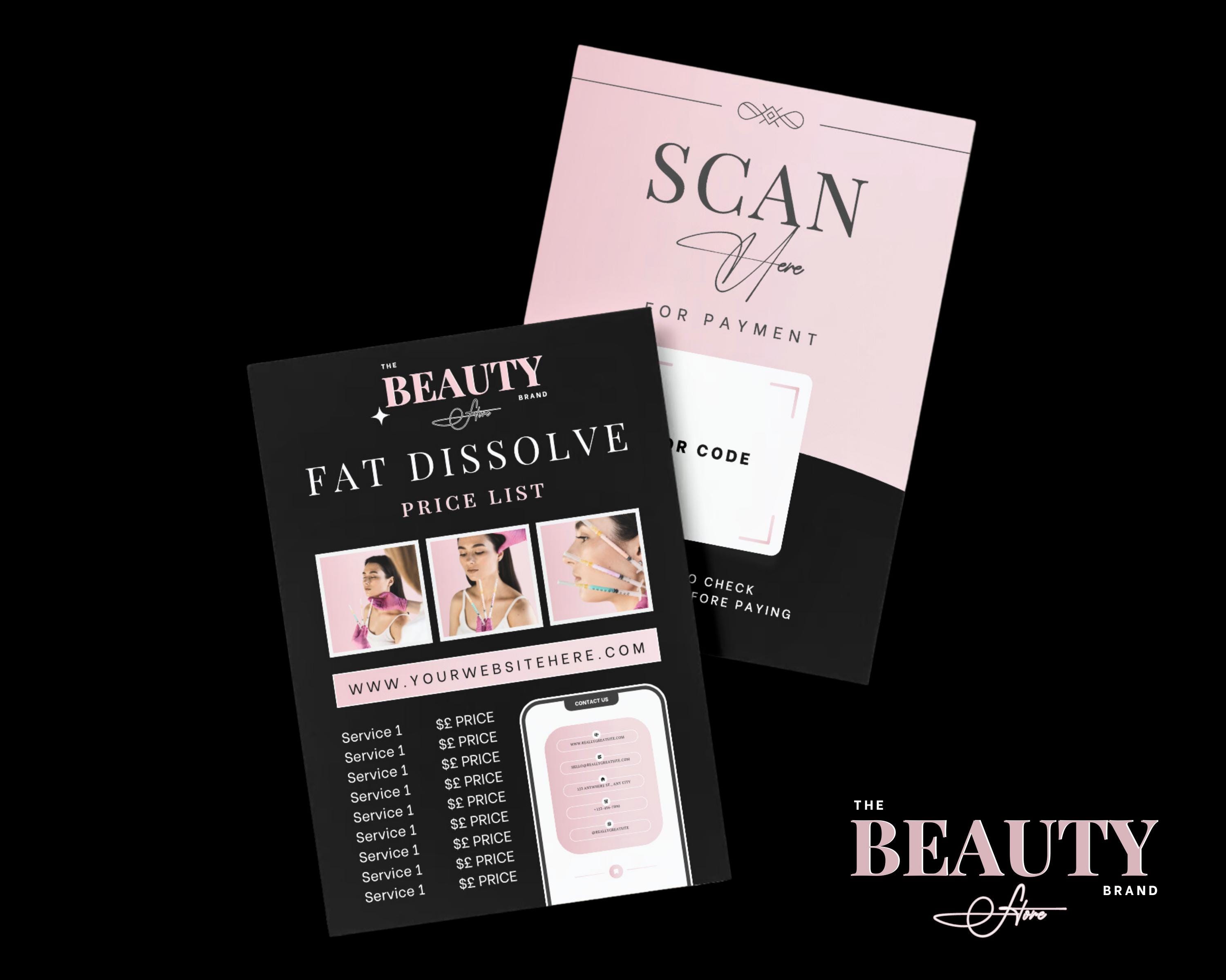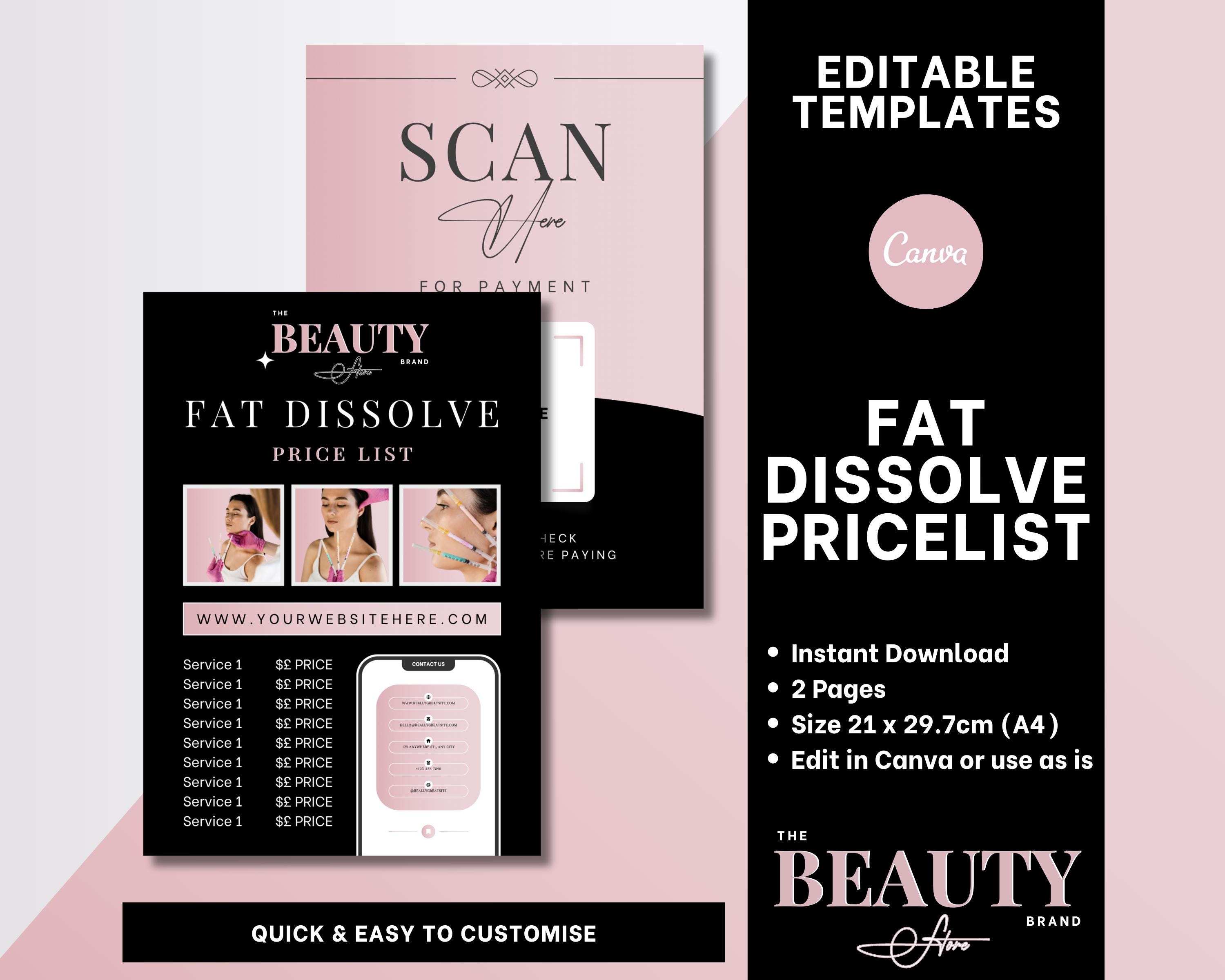 Fat Dissolve Price List, Services Menu, Payment Methods, Editable Canva Templates
