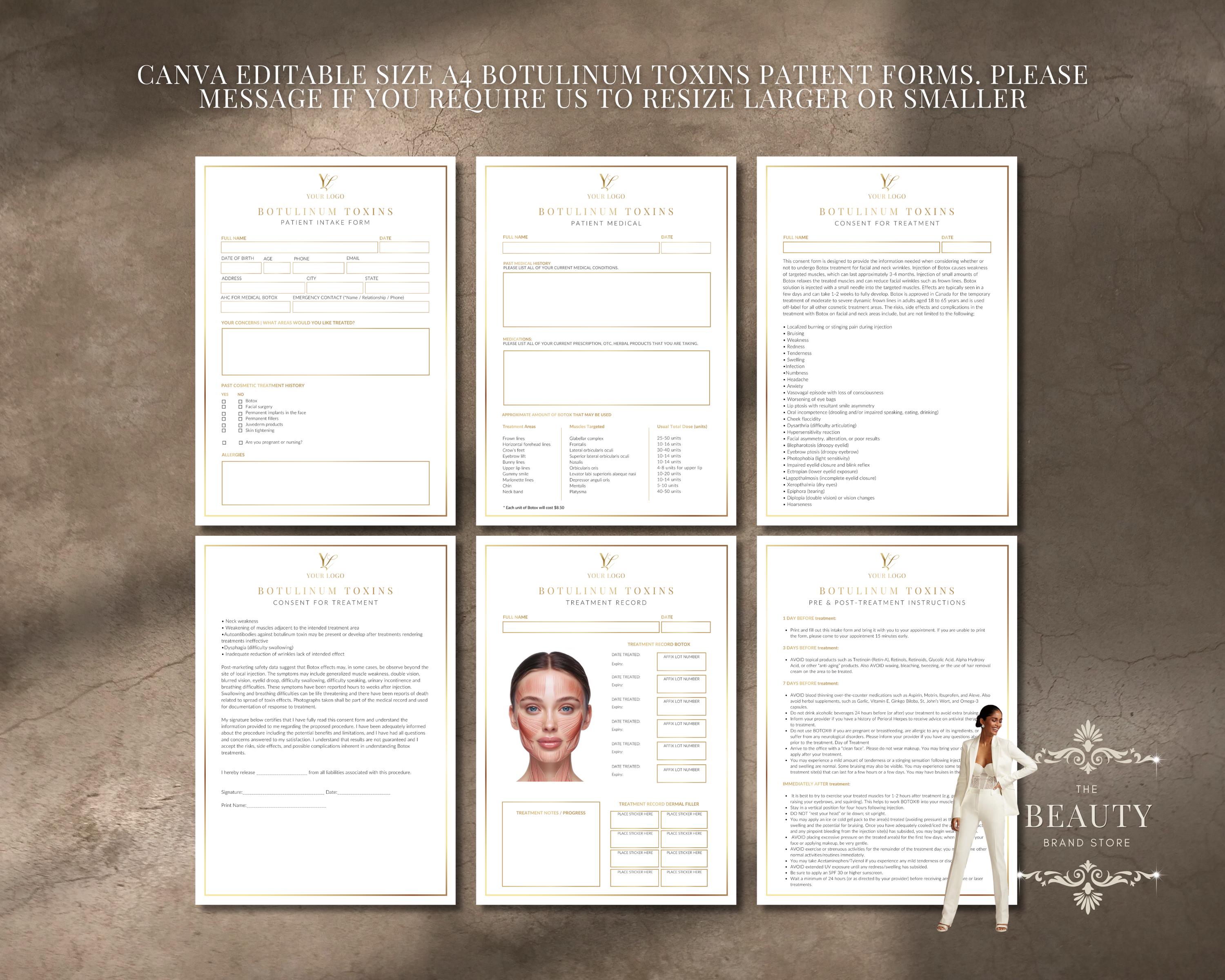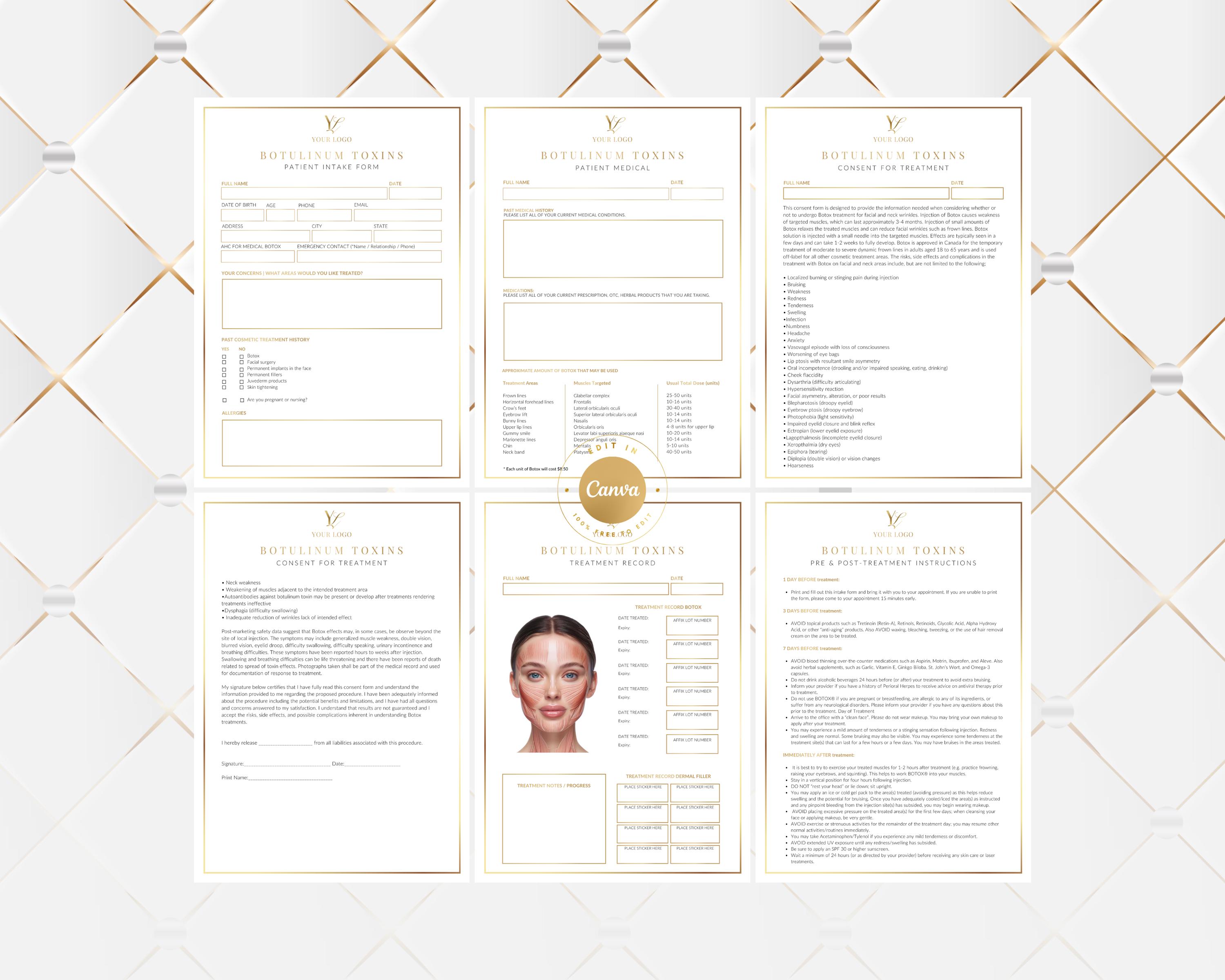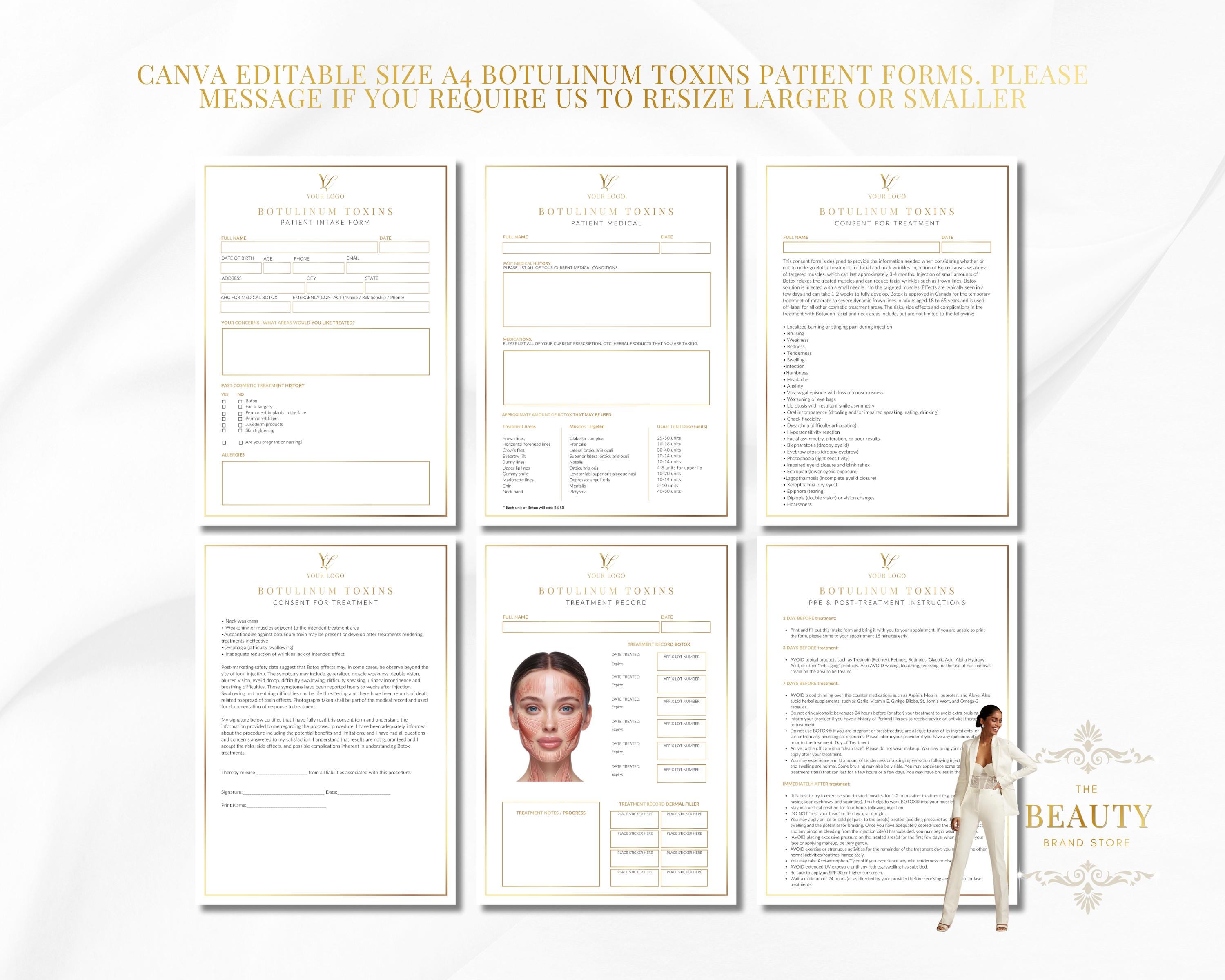 Editable Botulinum Toxins (Botox) Patient Forms, Consultation, Consent, Treatment Record, Pre & Post Care, Neurotoxins Nurse Injector Packet