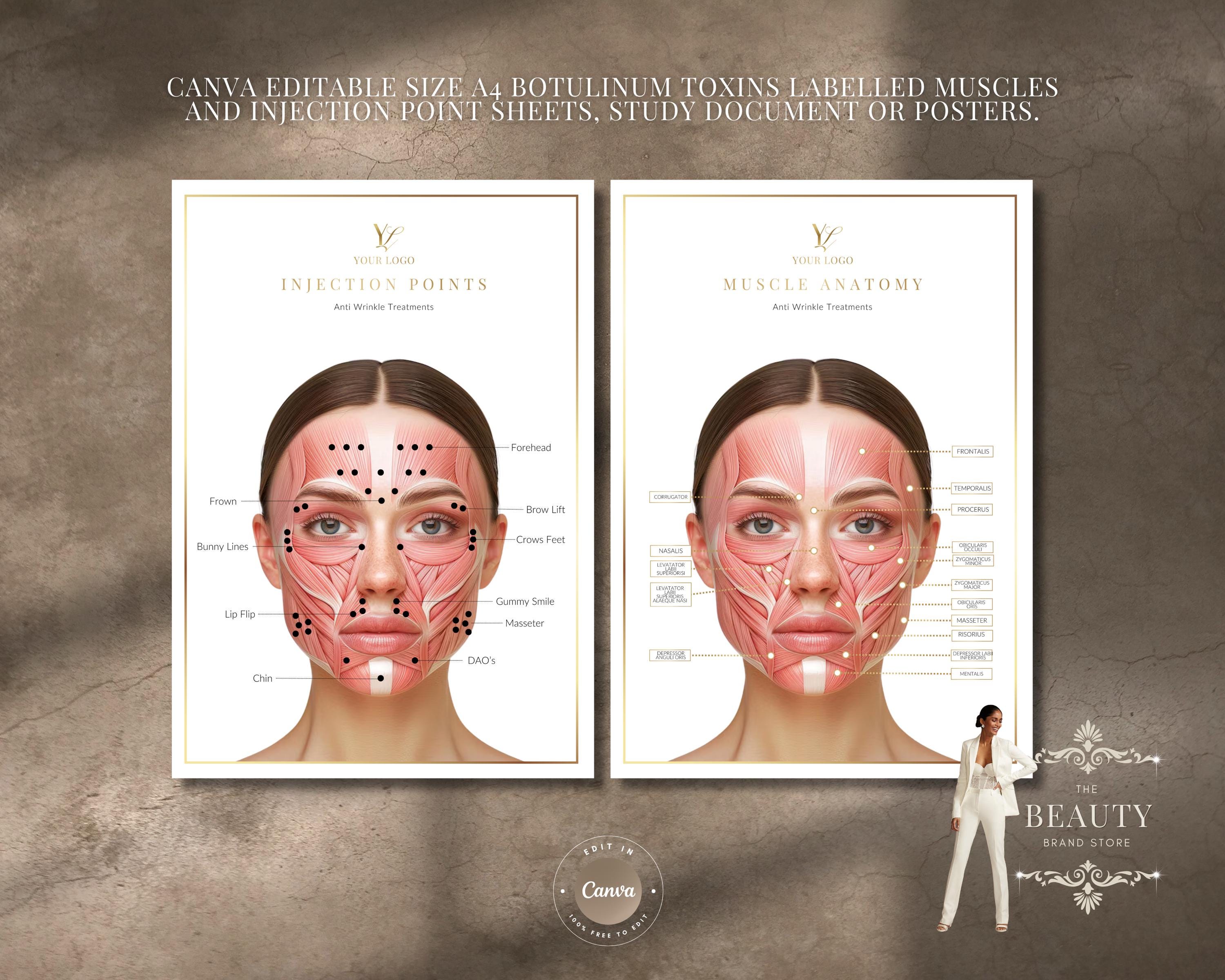 Botox Injection Points and Labelled Muscles of the Face, Canva Editable A4 Study, Reference Guides or Wall Art for Botulinum Toxin Injectors