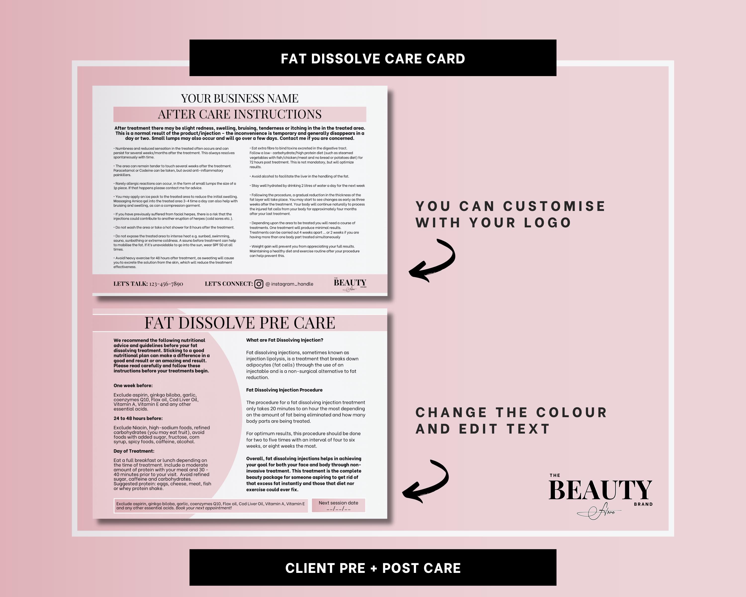 Fat Dissolve Client Care Card, Pre Treatment Care, Post Treatment Care, Editable Canva Template