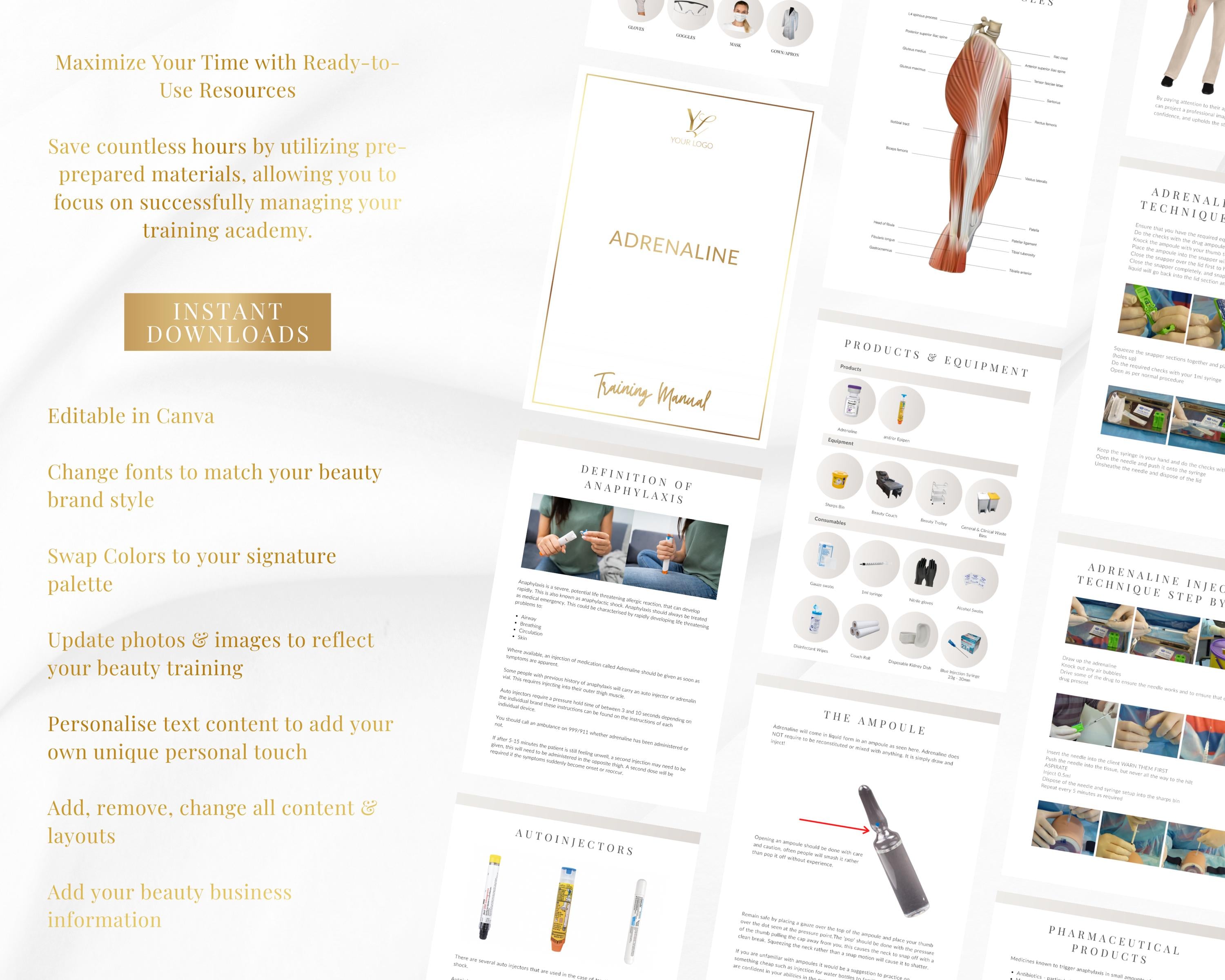 The bundle features a fully editable training manual, a corresponding training presentation, a comprehensive theory exam, and a professional certificate of achievement, all designed in Canva. Each component can be tailored with the client’s branding, colors, and style, ensuring it feels distinctive to their academy, while also saving countless hours on research and writing.