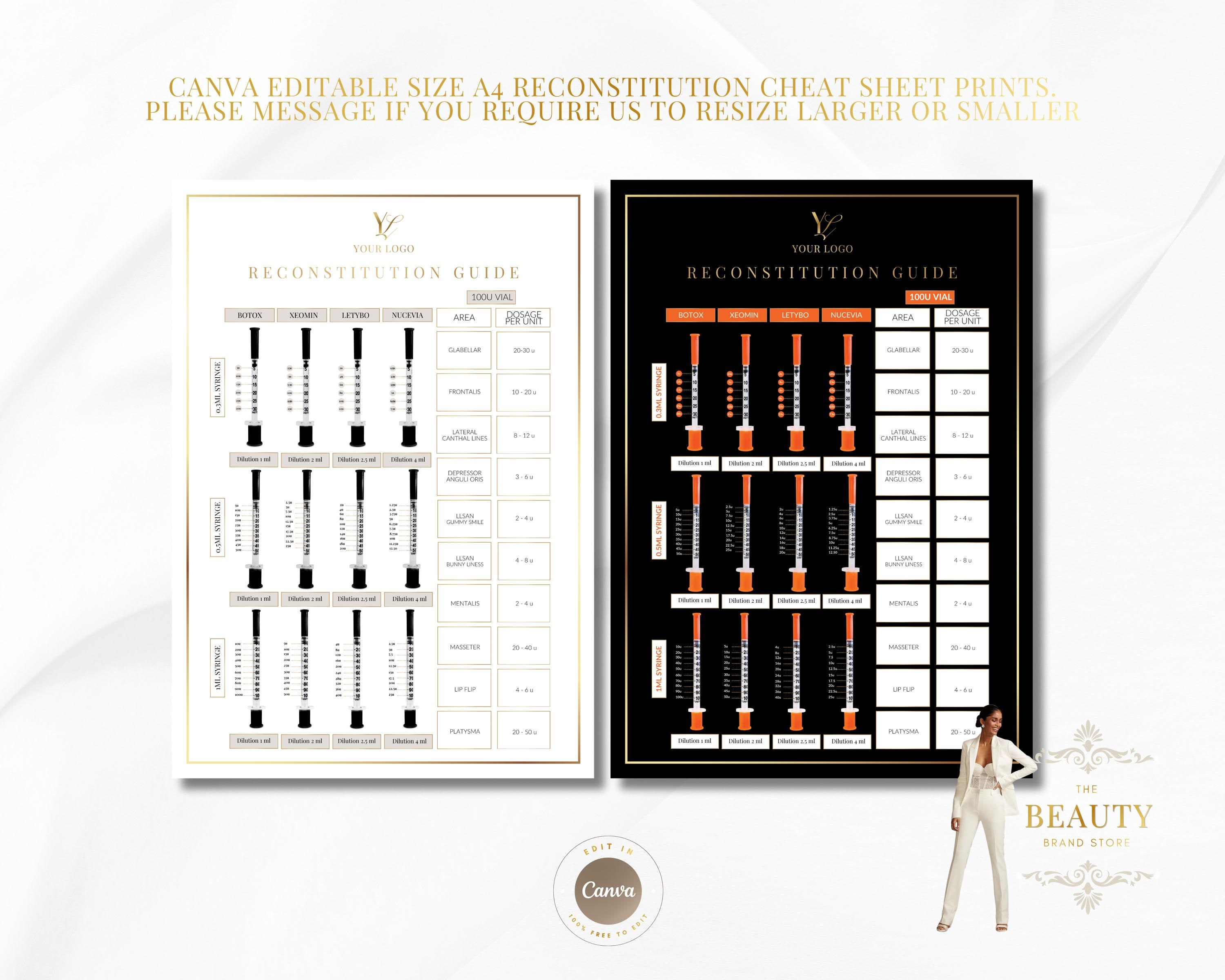 Botulinum Toxins Reconstitution & Dosing Chart, Aesthetics Nurse Injector Guide, Botox Cheat Sheet, Medspa Training, Neurotoxin Units, Editable & Printable