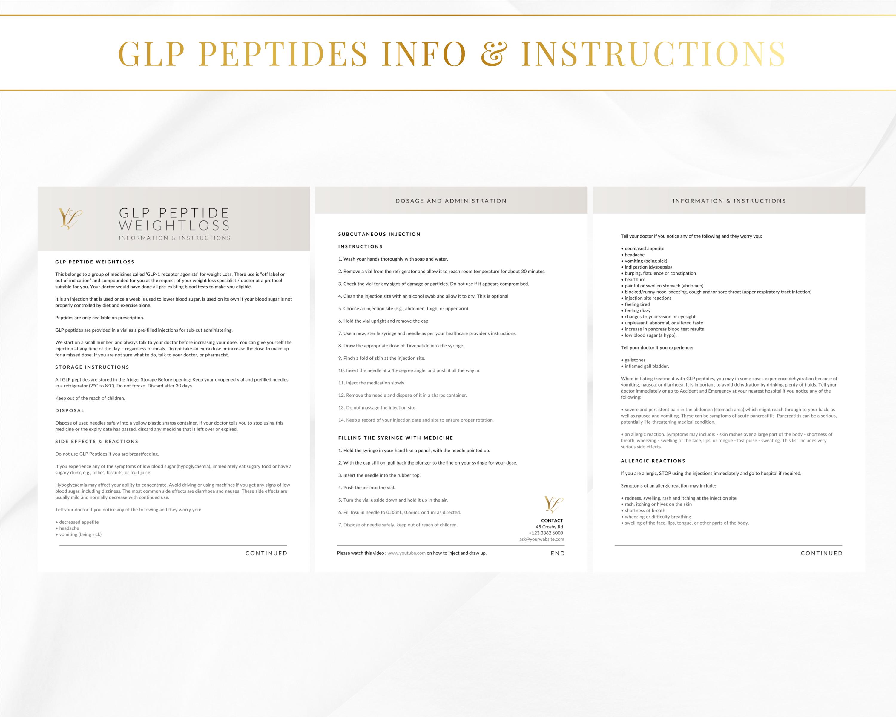 4 Pages - Includes: GLP PEPTIDE WEIGHTLOSS INFORMATION | STORAGE INSTRUCTIONS | DISPOSAL | SIDE EFFECTS & REACTIONS | ALLERGIC REACTIONS | SUBCUTANEOUS INJECTION INSTRUCTIONS | FILLING THE SYRINGE
