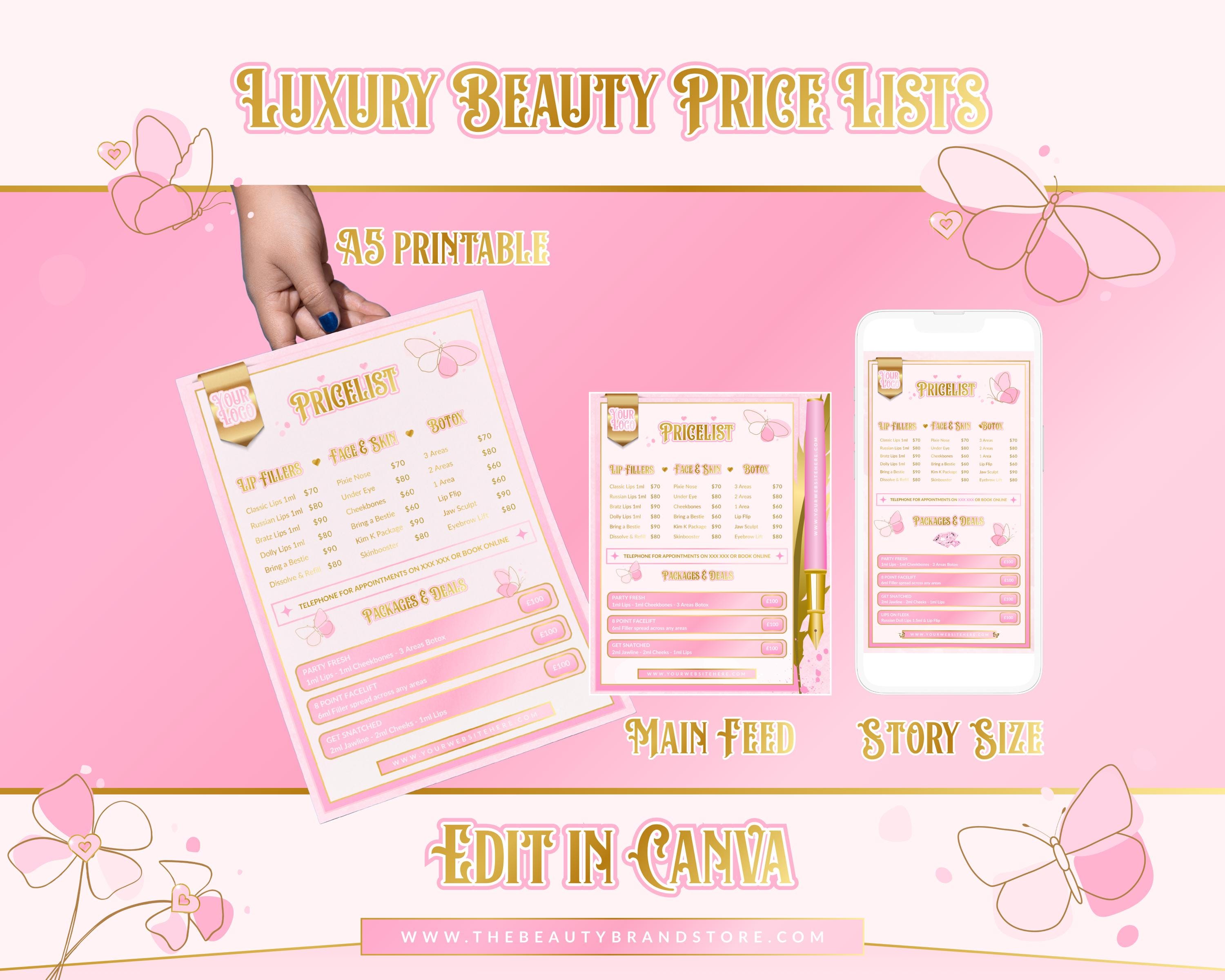 Pink & Gold Beauty Price List Template - Editable Canva Design (Digital Download)
