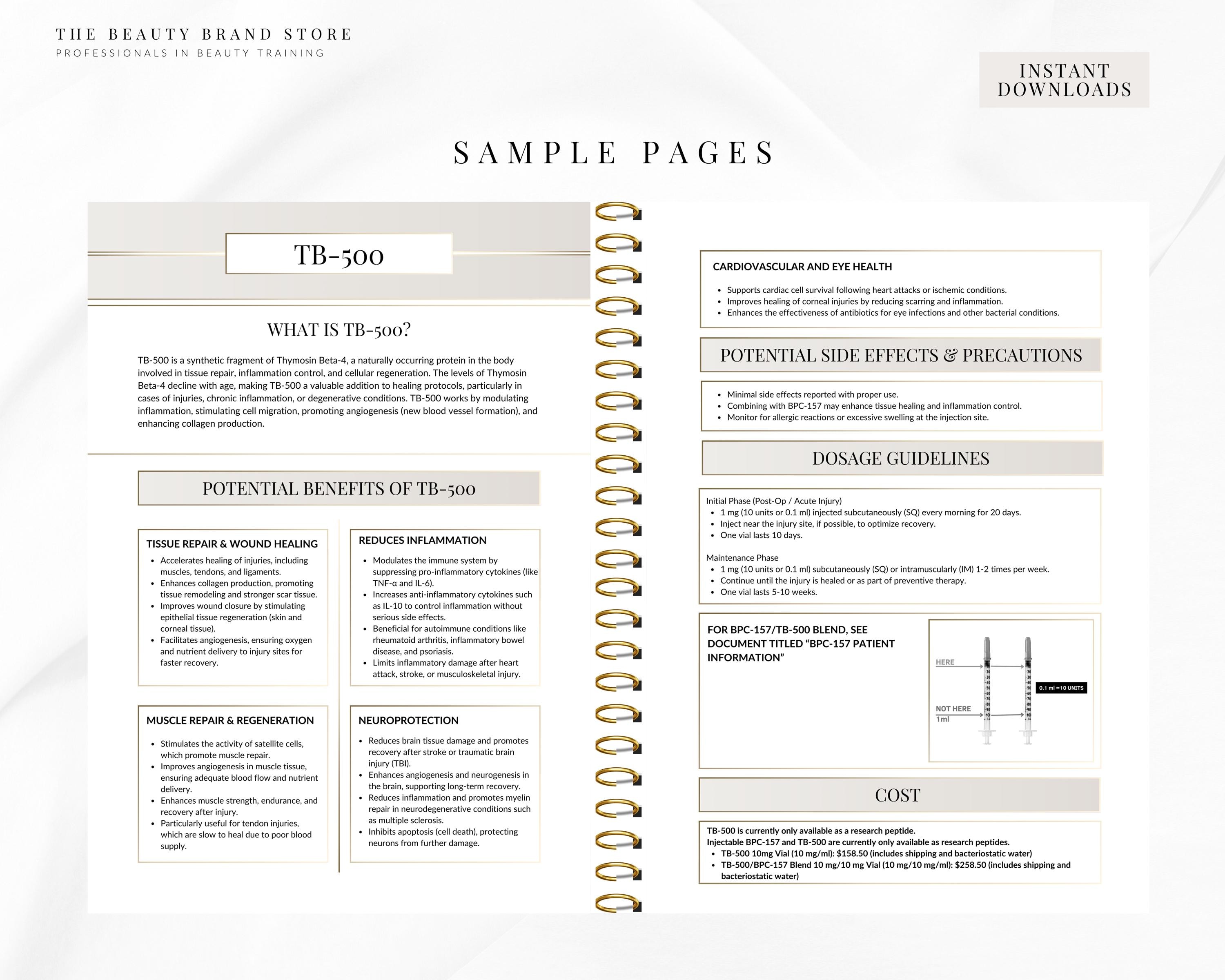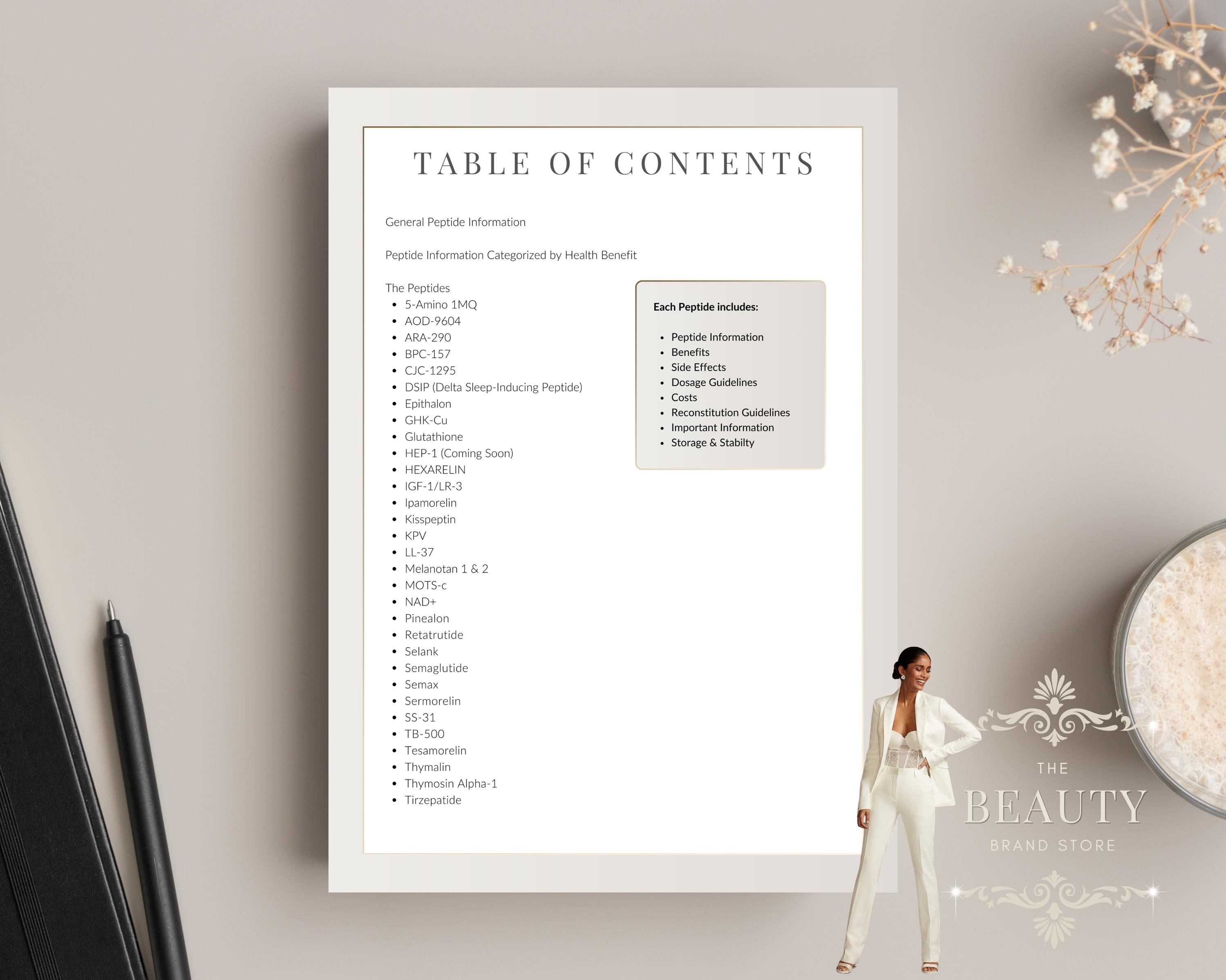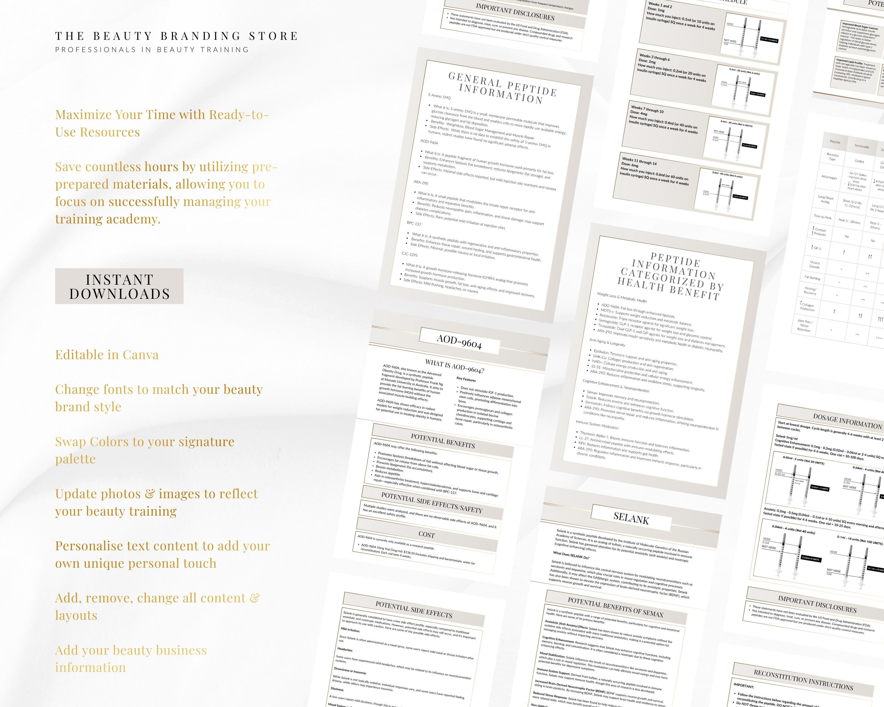 This guide is an all in one bundle for medspas, clinics & stores that offer peptides or sell them! An informative and editable ebook that includes A-Z of therapeutic peptides. For each peptide the content includes the peptide information, safety, benefits, costs, dosage, instructions, protocols and reconstitution. As well as being a complete guide, it has the added benefit of being designed so you have the option to print the peptide information pages out individually and handout to your patients along with their peptide of choice! And of course the added benefit is that this template is completely editable so you can change the colour scheme, font, add images, company information..however you would like it is 100% free to edit in Canva.