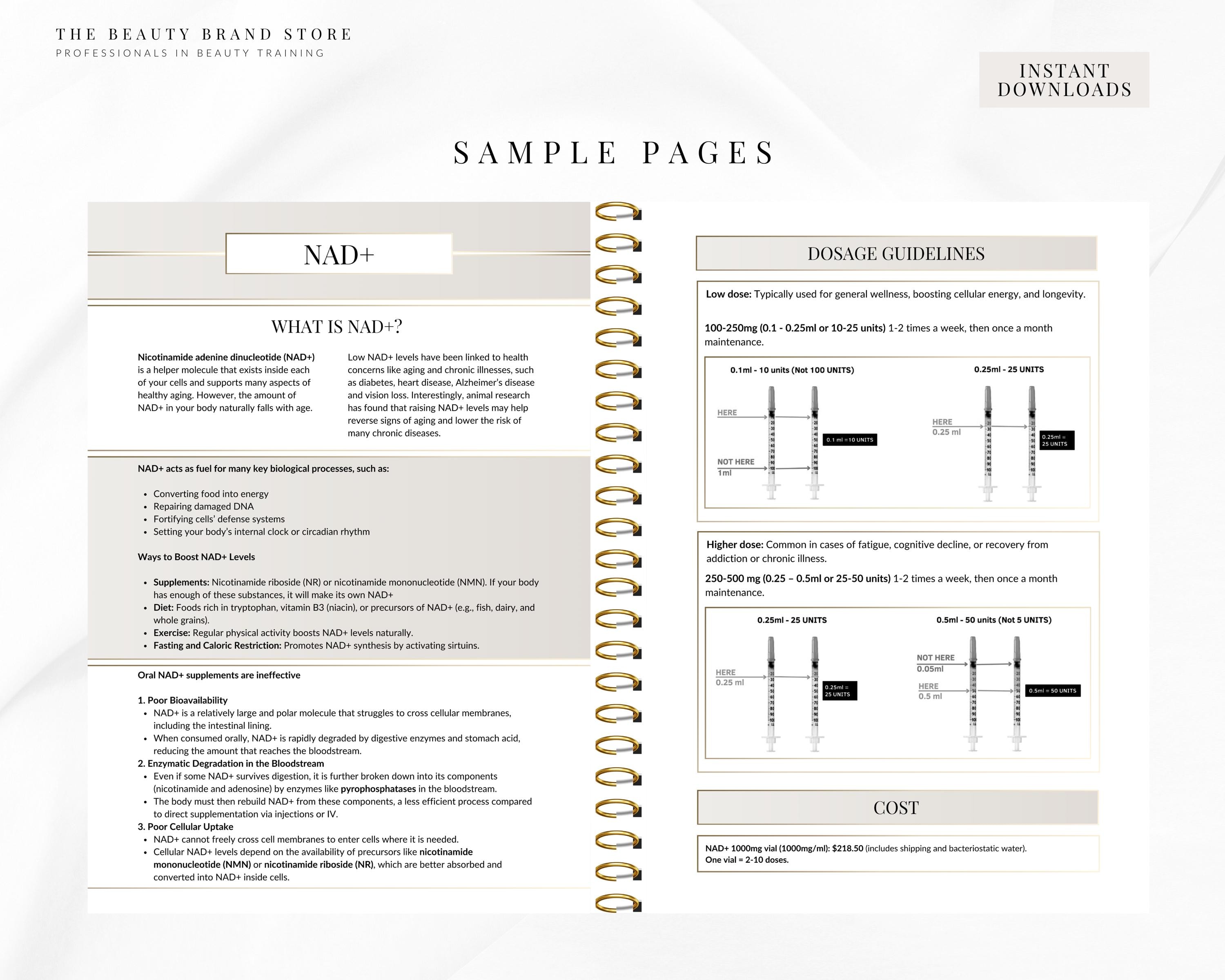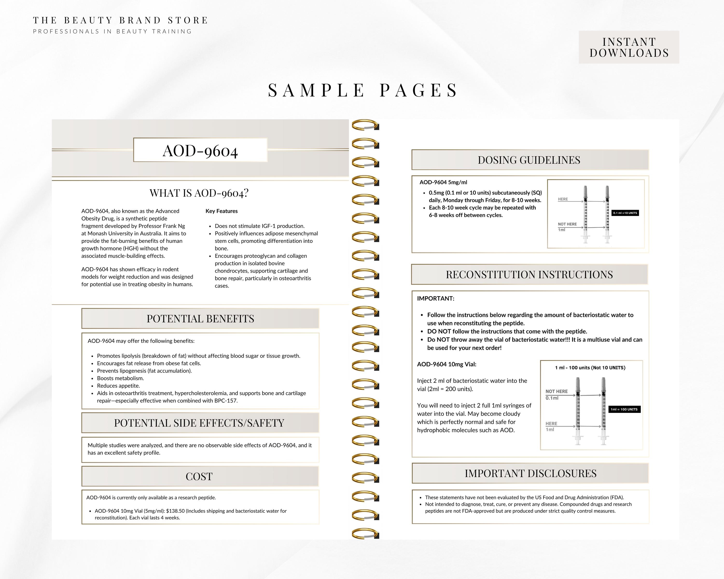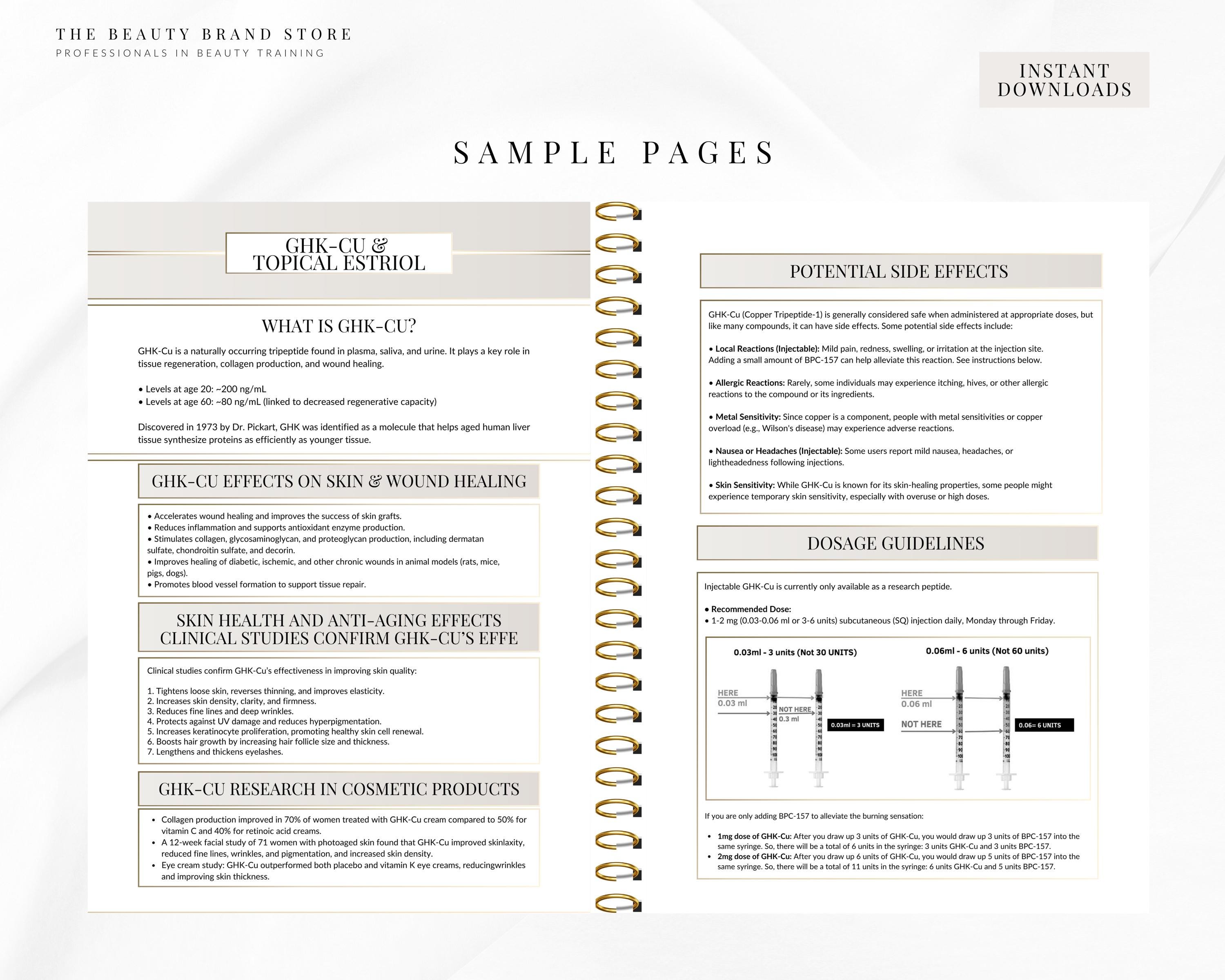 This guide is an all in one bundle for medspas, clinics & stores that offer peptides or sell them! An informative and editable ebook that includes A-Z of therapeutic peptides. For each peptide the content includes the peptide information, safety, benefits, costs, dosage, instructions, protocols and reconstitution. As well as being a complete guide, it has the added benefit of being designed so you have the option to print the peptide information pages out individually and handout to your patients along with their peptide of choice! And of course the added benefit is that this template is completely editable so you can change the colour scheme, font, add images, company information..however you would like it is 100% free to edit in Canva.