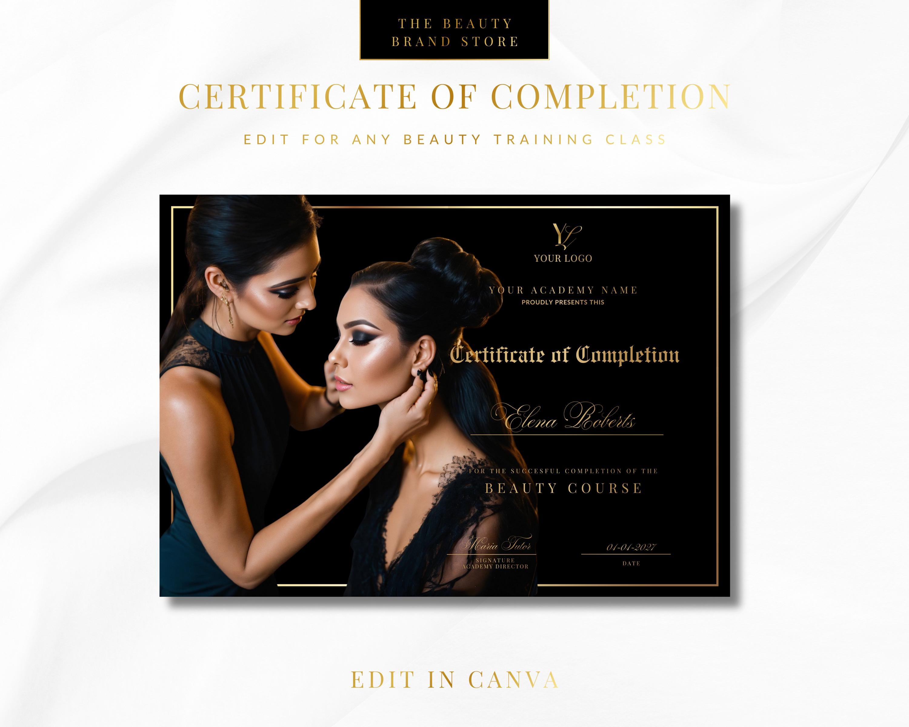 Training Certification Diploma for any Beauty Academy, Hair, Nails, Makeup, Lash, Aesthetics Class, Edit in Canva Certificate of Completion